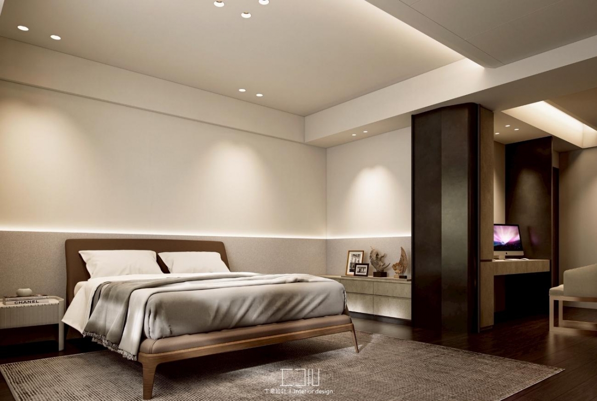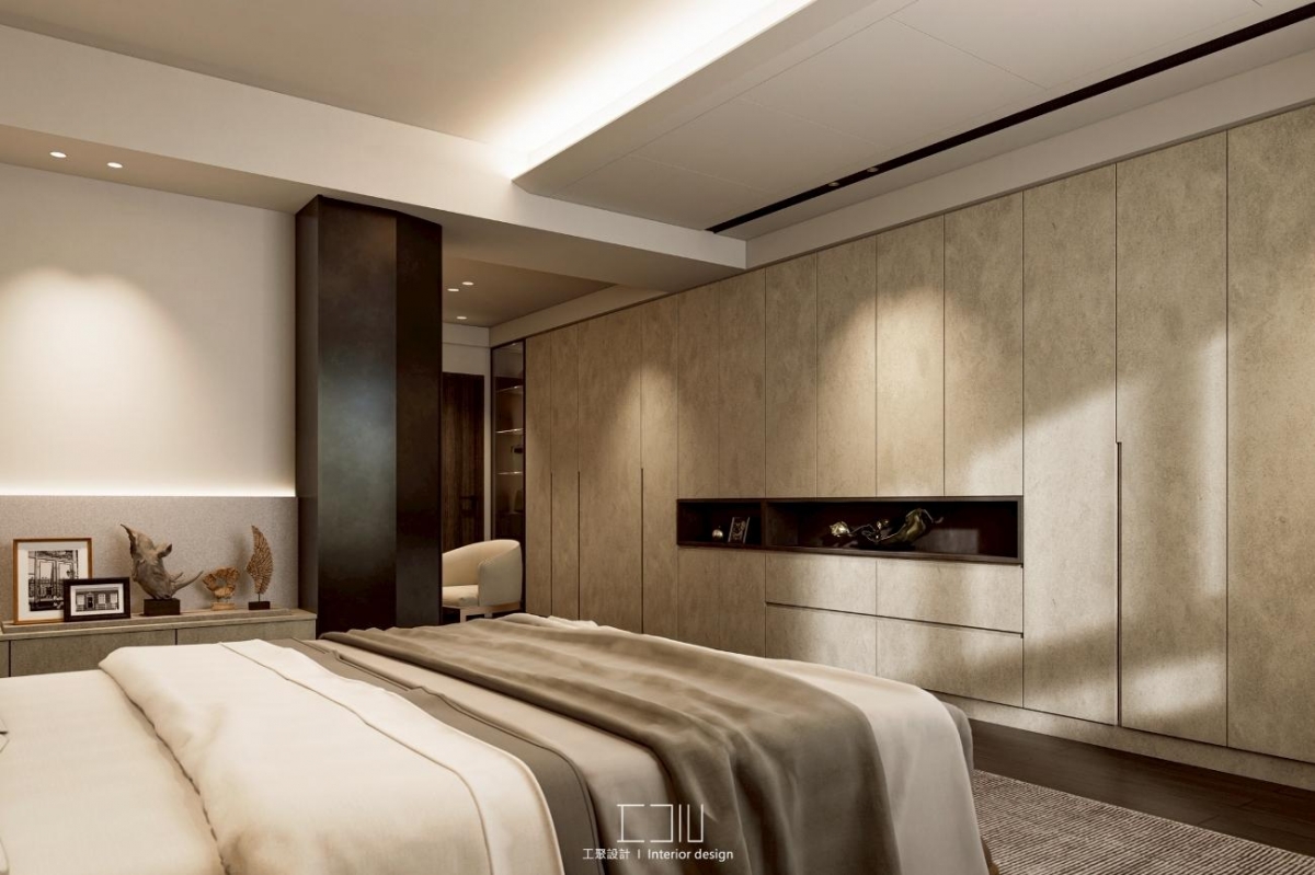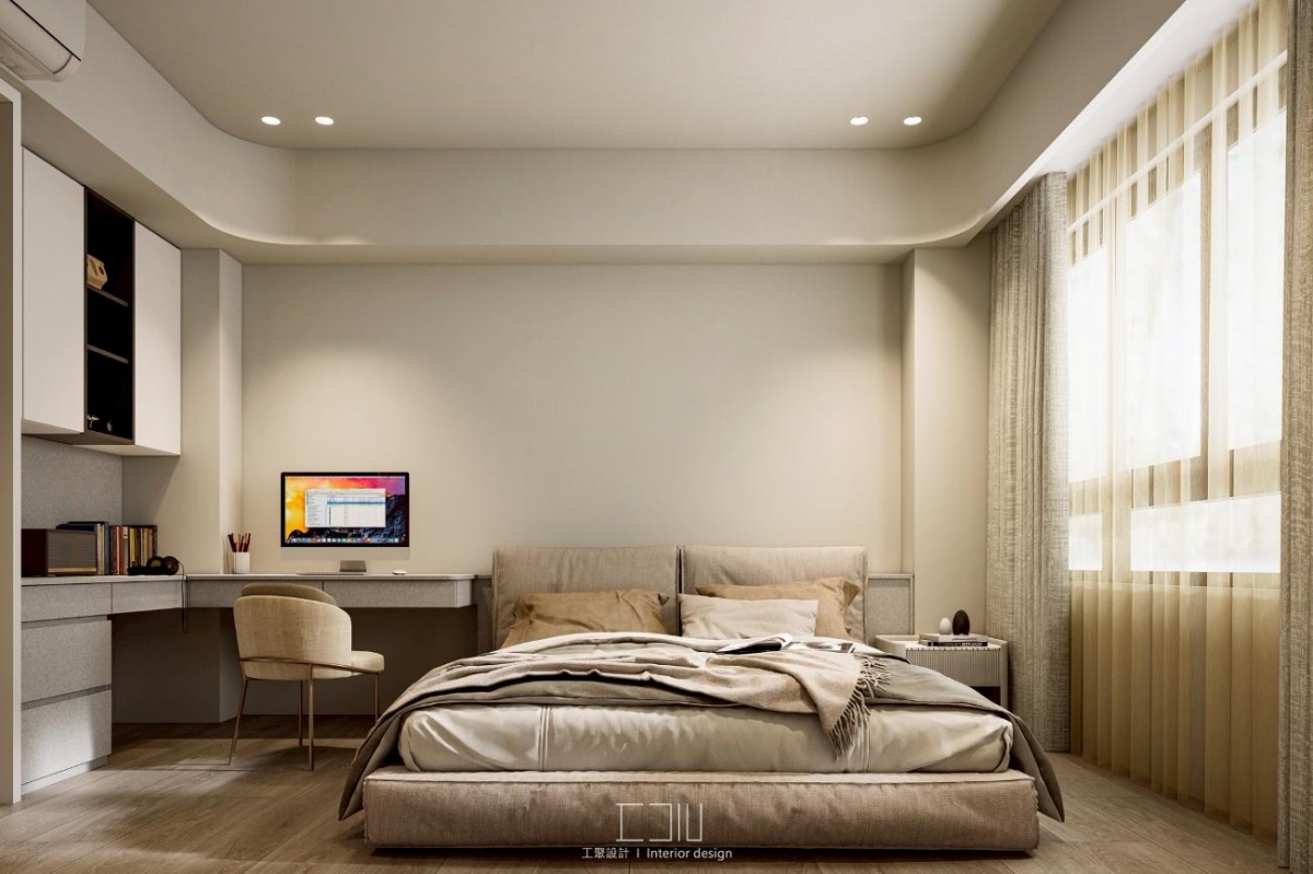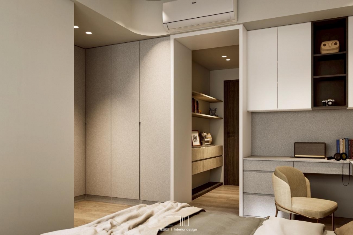 主臥強調私密性與舒適性,設計上選擇柔和色系如米白、灰藍,結合繃布床頭與質感壁紙,營造靜謐的休憩空間。