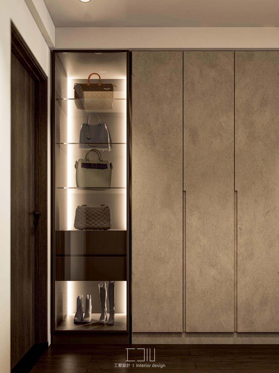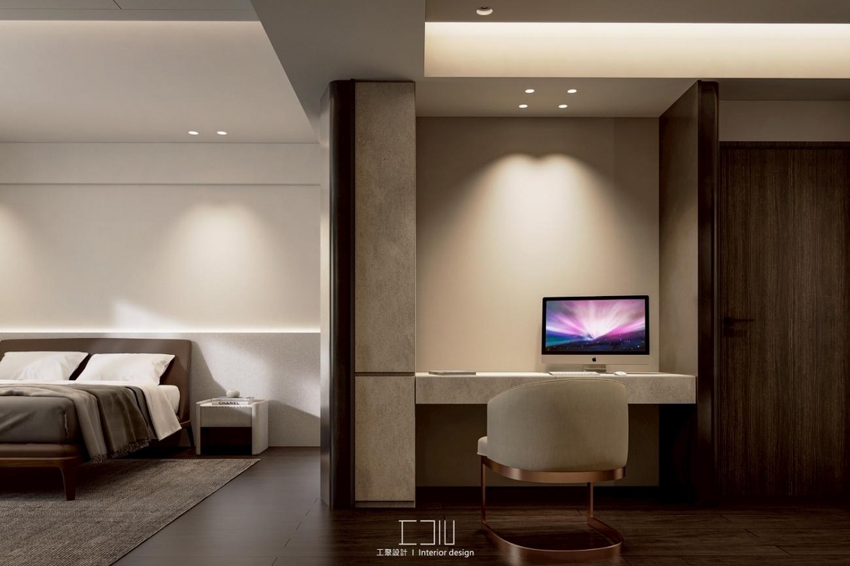 衣櫃設計採推拉門搭配玻璃材質,既保有收納機能,也延伸視覺開闊感。床尾規劃小型起居區,滿足日常閱讀與休憩需求。
