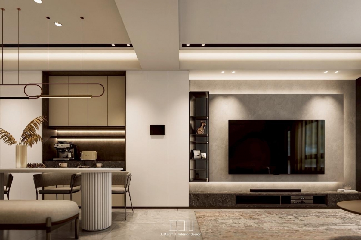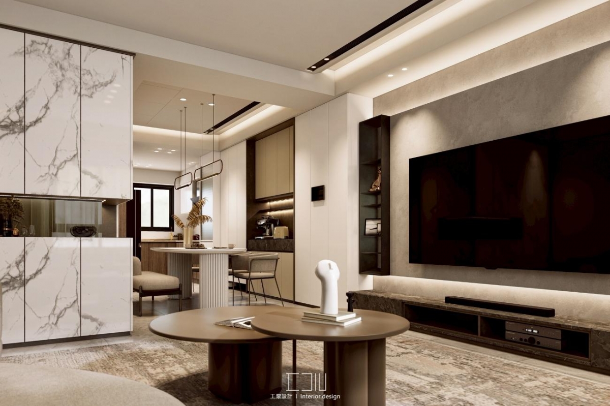 營造簡潔卻不失溫度的生活氛圍。電視牆面以特殊漆材點綴,提升整體視覺質感,