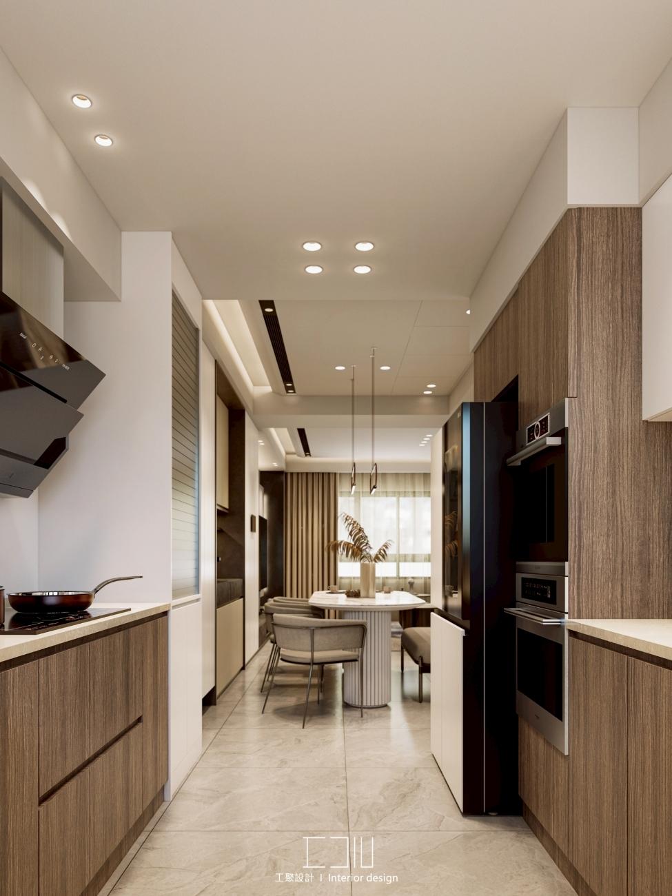廚房選用極簡門板與隱藏式把手設計,整體線條清爽俐落,搭配現代化家電設備,實用與美觀兼具。