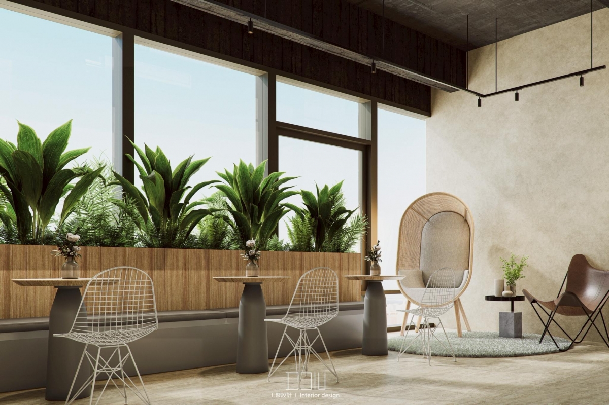 綠映區: 沿著大窗設置木作高台植栽箱,種植茂盛的綠色植物,營造出半戶外花園的療癒氛圍。