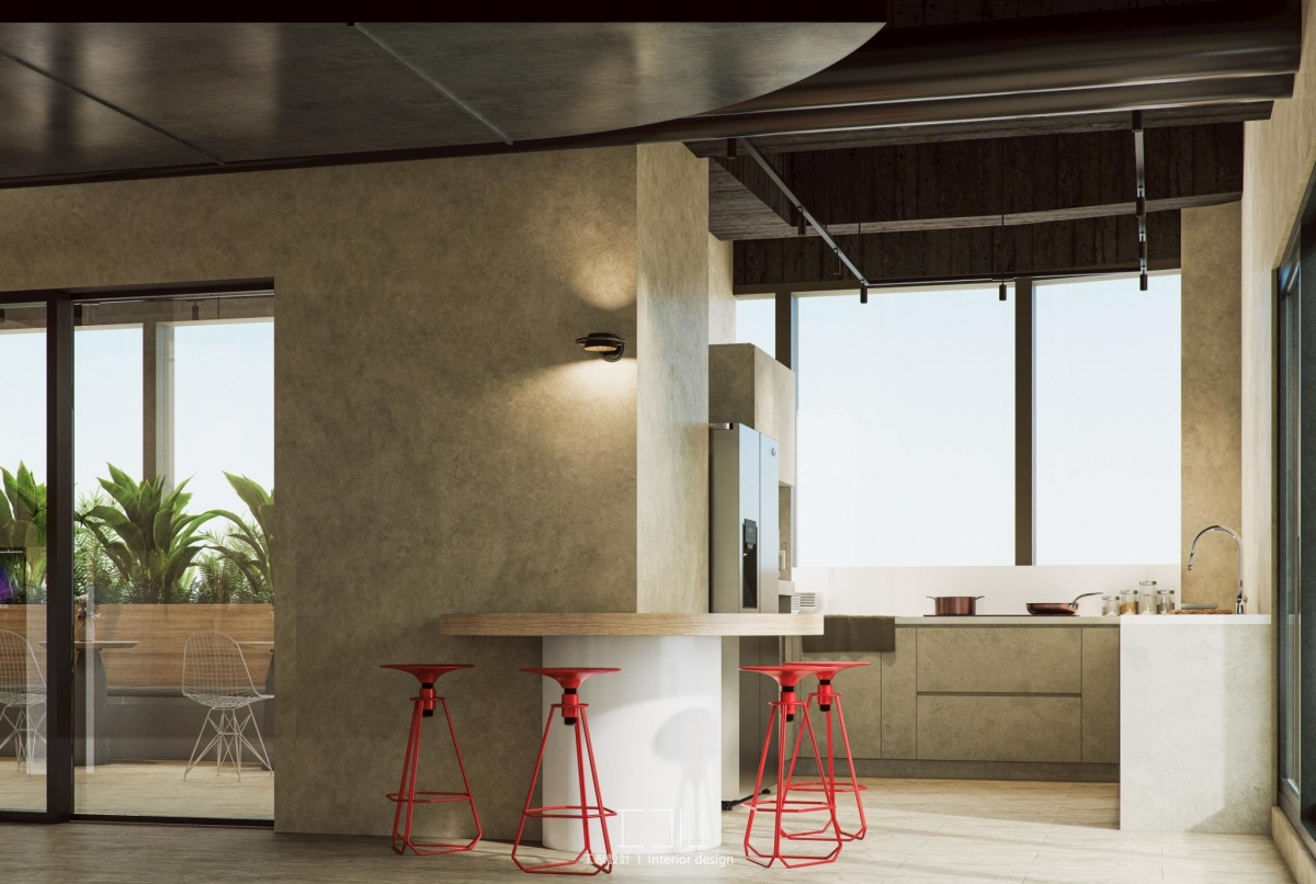 桌台區: 設置半圓弧形桌台,搭配暖木色檯面,並選用醒目的紅色金屬高腳椅,為簡約的工業空間增添一抹現代的跳色元素。